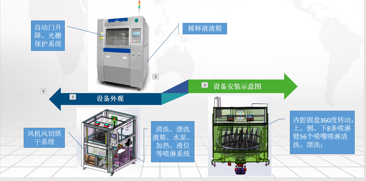3、科學(xué)的噴嘴設(shè)計(jì)(專利):采用上、中、下共8條噴淋臂分布--徹底解決清洗盲區(qū),噴淋臂、噴嘴可拆卸;4、可視化噴嘴壓力可調(diào)節(jié):解決了小工件尺寸在清洗中受高壓噴淋條件下的碰撞、飛濺問題;