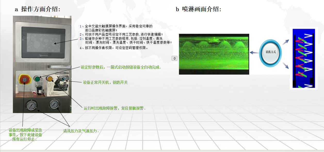 7、清洗、漂洗采用在線獨(dú)立的內(nèi)置過濾系統(tǒng)、獨(dú)立的電動泵、獨(dú)立的噴淋臂、獨(dú)立的噴嘴,溶劑的循環(huán)7、使用,防止清洗和漂洗盡少串液,可提升漂洗水使用壽命,減少溶劑用量;