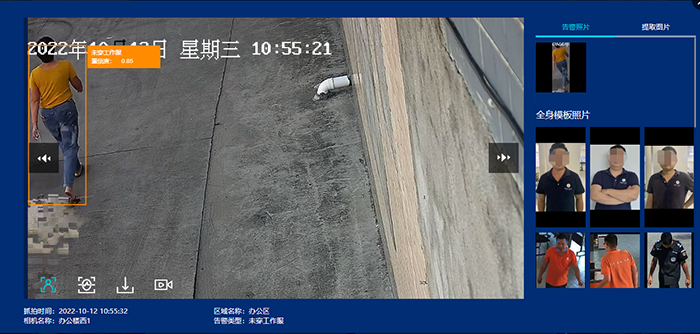 工服檢測:對圖片中未穿工作服的情況做檢測,給出位置信息,如圖是進入廠區(qū)后未更換工作服的告警;