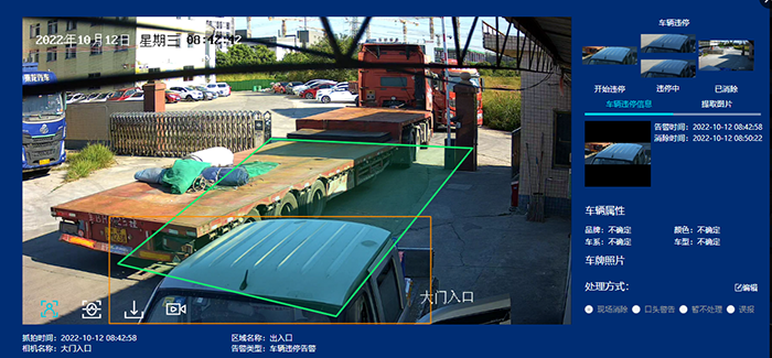 違停檢測:AI智能盒子對圖片中違反劃線區(qū)域停放車輛的情況做檢測,給出位置信息,如圖是車輛在工廠出入口違停的告警;