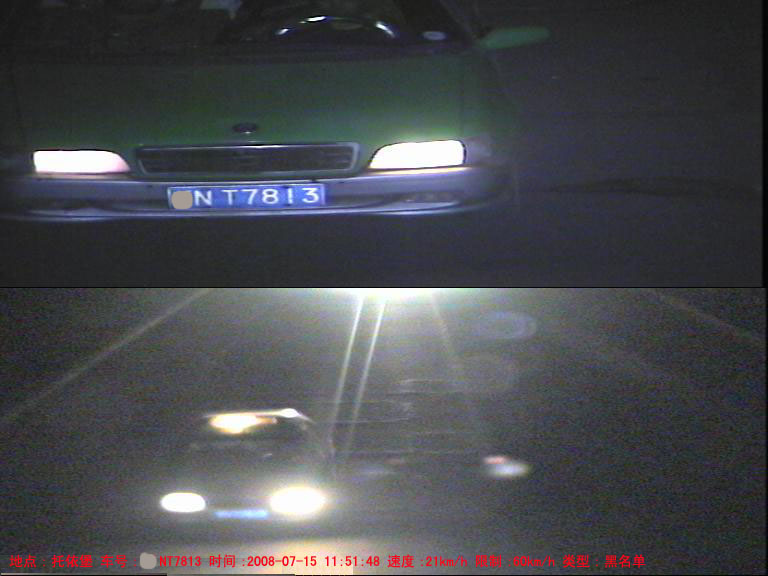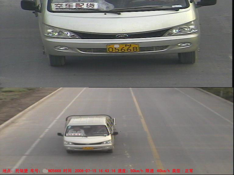 系統對通過檢測線圈的每個車輛進行圖像抓拍,包括特征圖像(車頭特寫)及車輛全景圖像兩張彩色圖片,每個圖片的分辨率為768*288,24bit真彩色。在抓拍圖像中,系統能夠將檢測到的車輛基本信息,如日期、時間、地點、方向、牌照號、車速、車輛類型(嫌疑、超速、正常)等疊加在全景圖像上,便于人工判別及事后取證。